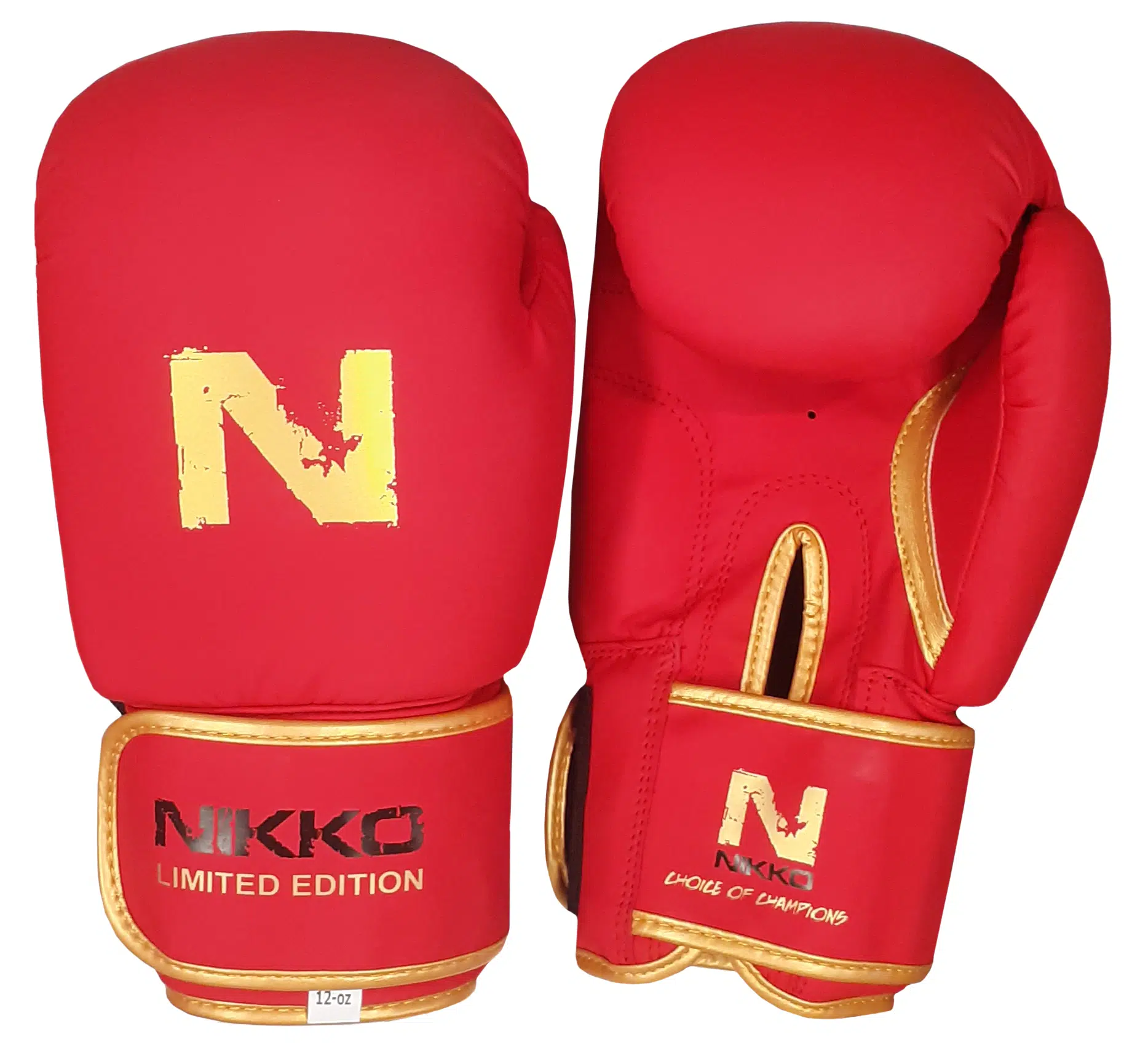 Maak je outfit compleet met deze rood met gouden bokshandschoenen.