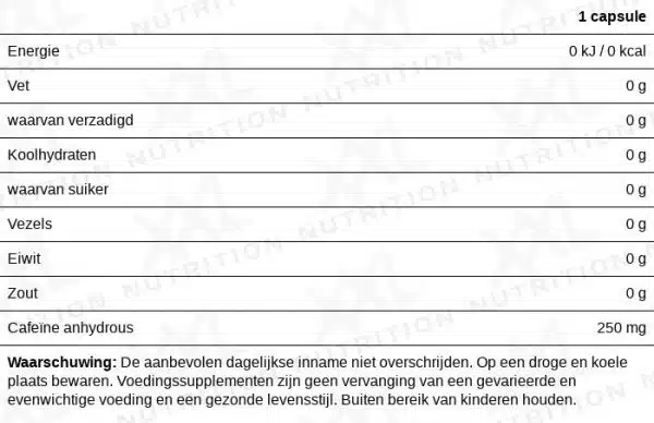 Cafeïne anhydrous, vulstof: microkristallijne cellulose, capsuleomhulsel: (hydroxypropylmethylcellulose, kleurstof: ijzeroxide), anti-klontermiddel: magnesiumzouten van vetzuren.